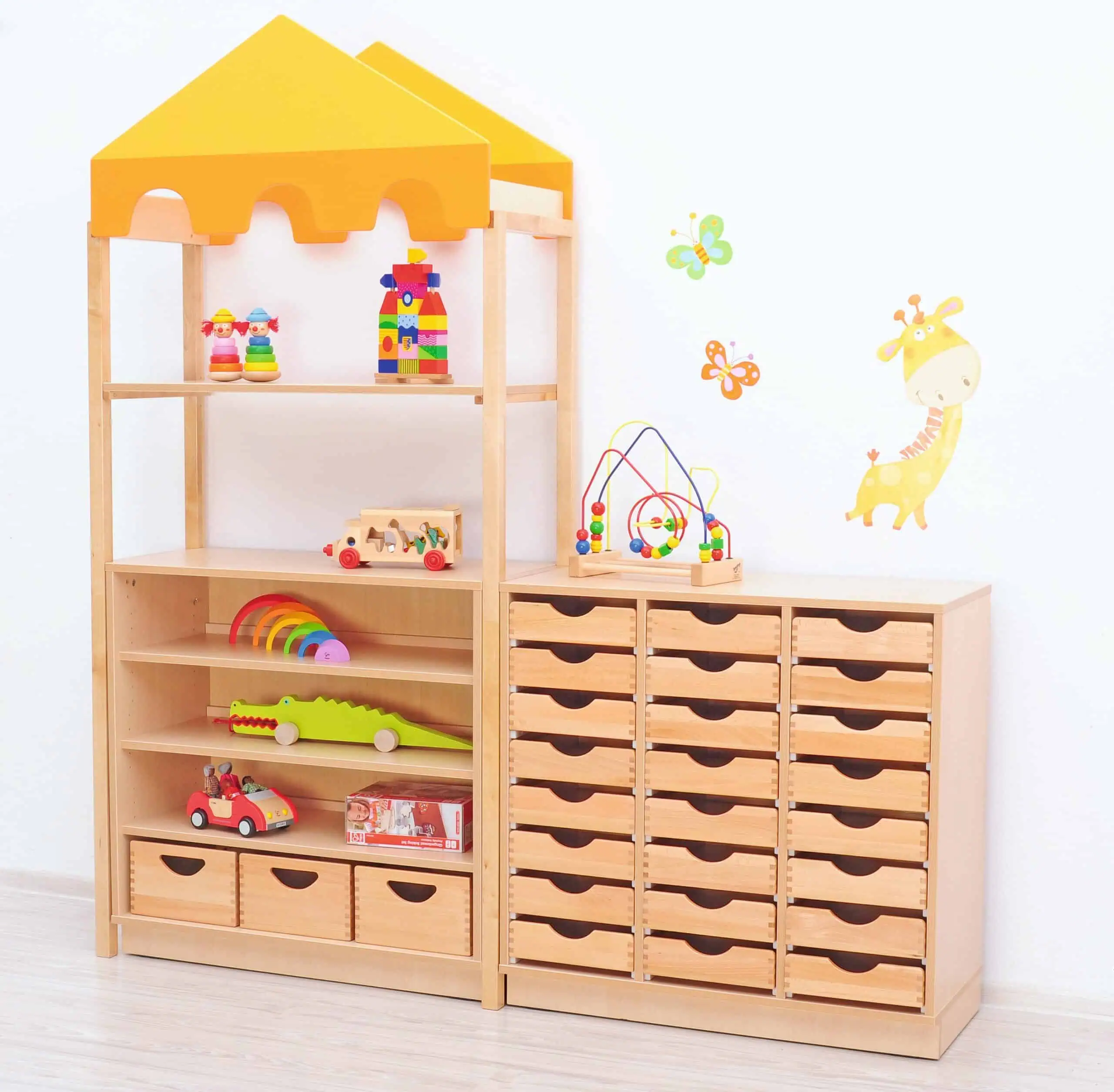 • 100299 M cabinet with partitions with plinth, 1 pc• 100289 M cabinet with 3 shelves with pilnth, 1 pc• 126045 Natural drawer, 24 pcs• 126044 Natural box, 3 pcs• 092627 Shelf for Flexi frames, 1 pc• 092623 Flexi roof – castle, 1 pc• 092625 Wooden frames for roof, high, 2 pcs• 100814 Slide guides, 24 pcs