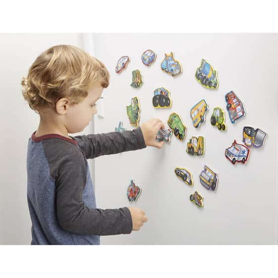 Bright wooden vehicle magnets for creative play on metal surfaces.